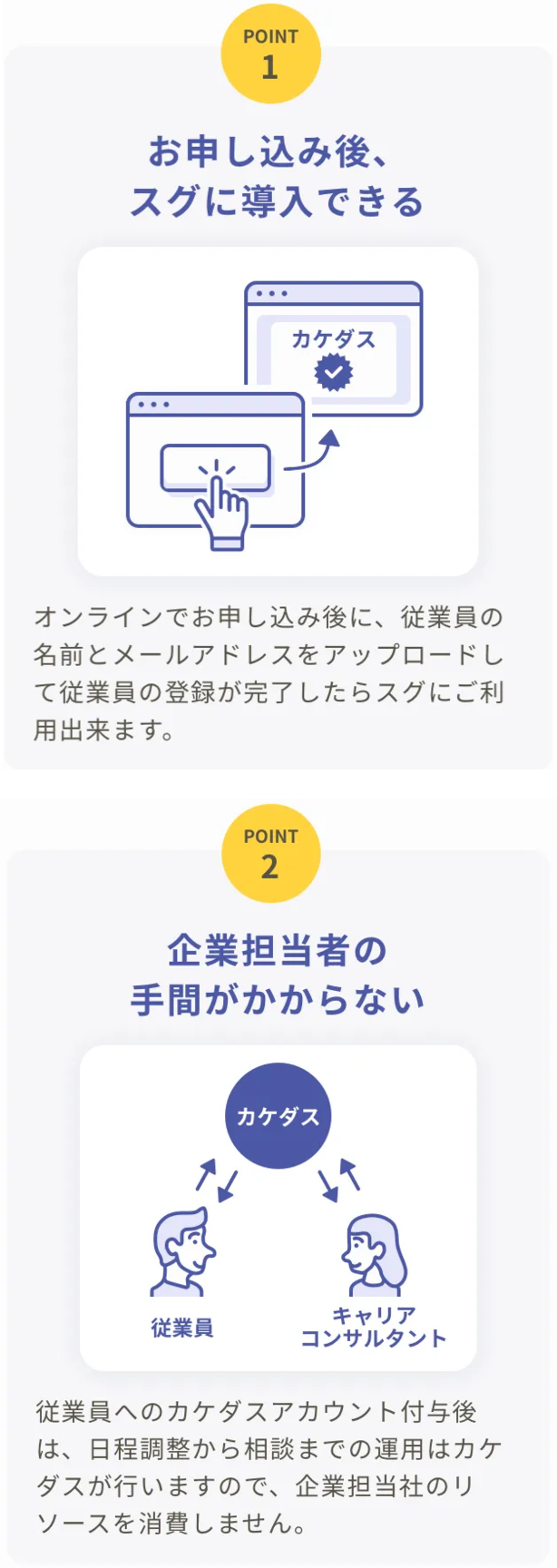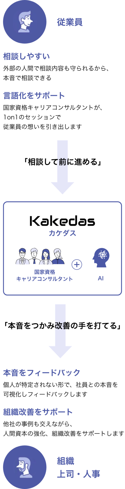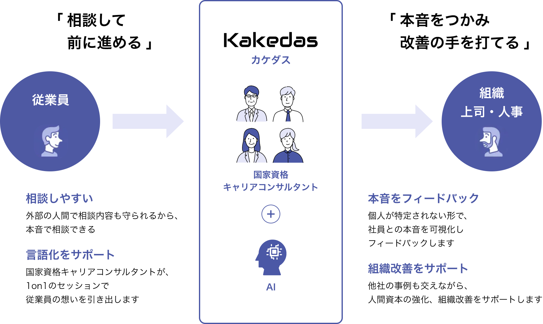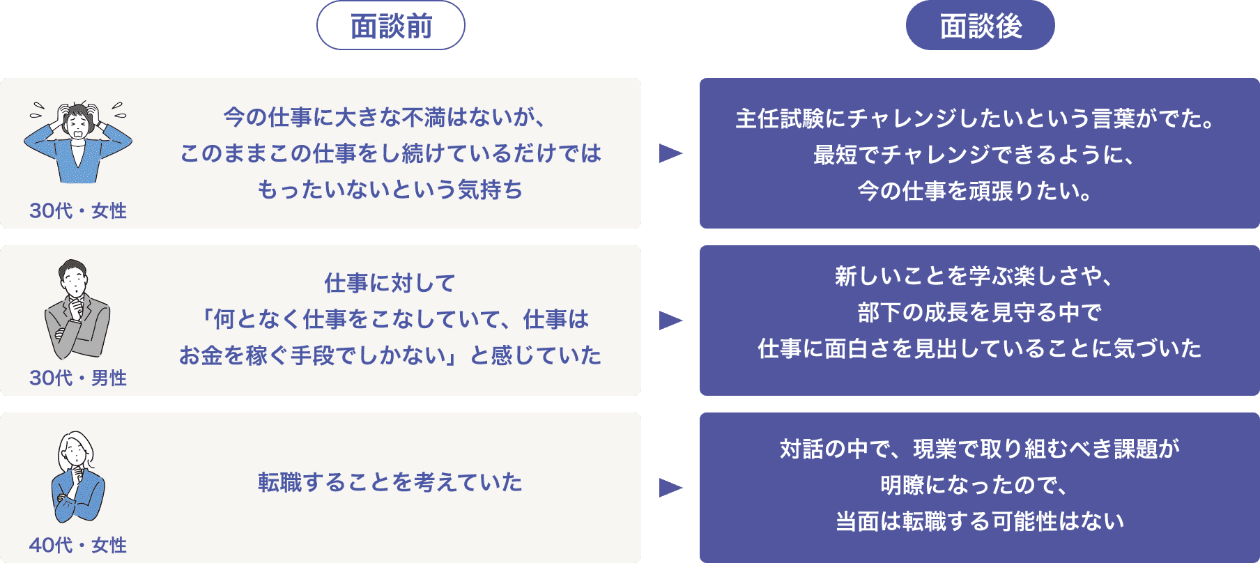 - キャリアコンサルタントは、転職を前提に相談を受けることはありません。社外の第三者だからこそなんでも話せ、メンタルヘルスの改善、御社への定着率の向上が見込まれます。