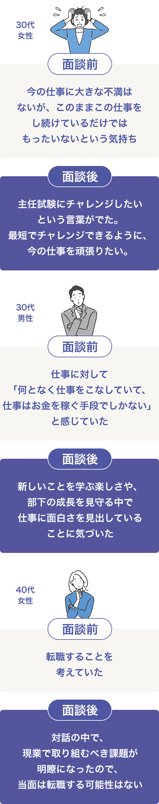 「社外の人に話を聞いていただいてとても心が楽になりました」社内でもあまり自分のことを話す機会がないので、話すことで改めて気が付いたり納得できたこと、矛盾点など客観的に話せることが出来ました。