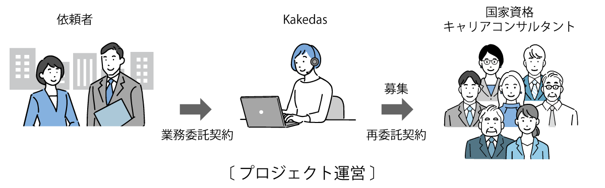 選べる利用形式「複数のキャリアコンサルタントを確保したい」「プロジェクトとして管理まで含めて切り出したい」という法人であれば、業務を遂行できるキャリアコンサルタントの募集から選考、また、プロジェクトの運営までを株式会社Kakedasが丸ごと受託します。